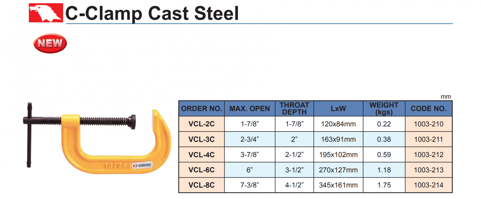 Cảo chữ C mã VCL-2C, VCL-3C ,VCL-4C ,VCL-6C , VCL-8C được nhập trực tiếp từ Vertex, CO, CQ được cấp bởi phòng thương mại Đài Loan, có đầy đủ kích cỡ cho bạn lựa chọn, kẹp chặt chắc chắn độ cứng vững cao. Sản phẩm được phân phối trên toàn quốc.