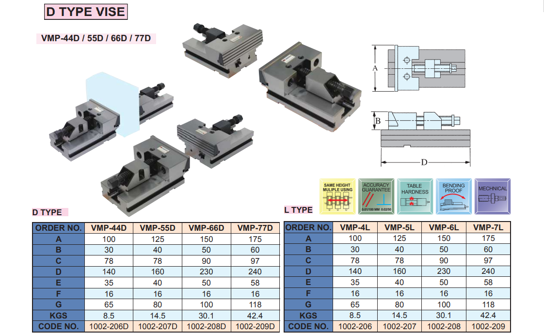 – Kiểu thiết kế cho các ê tô mô đun VMP-44D, VMP-55D, VMP-66D, VMP-77D thì chi tiết sẽ đặt trực tiếp trên bàn máy, nên khoảng kẹp độ cứng vững khi gia công rất cao.