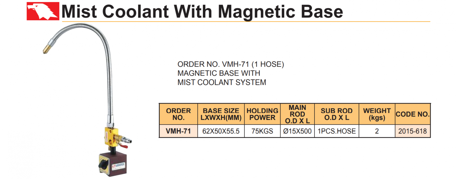 – Vòi tưới nguội dạng phun sương VMH-71 có đế từ kích thước 62*50*55.5mm. Lực hút từ của các đế từ đạt 75kgs. Rất chắc chắn khi kẹp trên bàn máy gia công. Thuận lợi khi cần di chuyển vị trí đặt vòi tưới nguội.